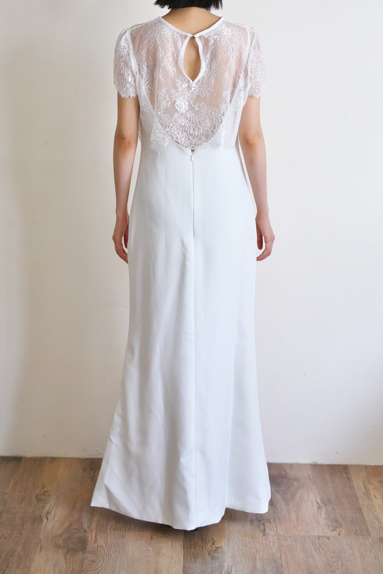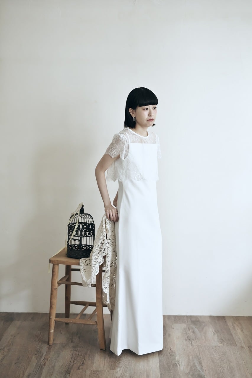エレガントなデザインが特徴のドレス。細見え効果を発揮し、華奢なシルエットを強調する繊細なレースが魅力。